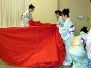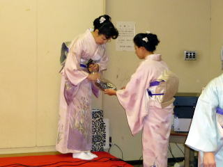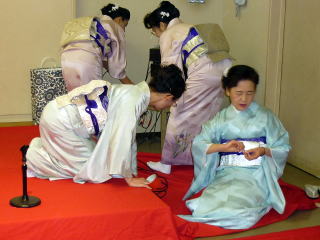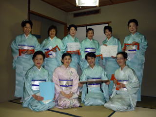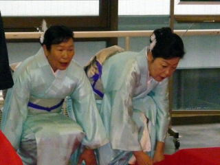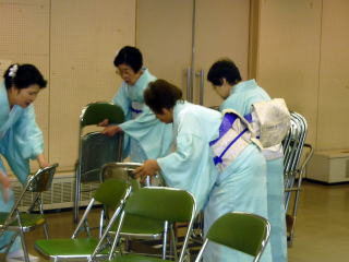 「平成22年度 淀の会 お弾き初め会」が、 1月31日(日)に開催されました。 ~開演前の準備~ 年に数多く出演させて頂きます舞台とは違いまして、 その日1日の最初から最後までの全てを 自分達で作り上げるお弾き初め会でございますので、 それはもう大変実のある1日でございました。 朝の集合時間も係りごとに決まっておりました。 早速それぞれにご自分に与えられた仕事を こなしていかなければなりません。 でもそれが苦ではなく、 皆さん生き生きとこなしてくださり、 よきチームワークの中で楽しく準備が出来ました。 宗家先生の身の回りの事、 また会全体の流れを把握し スムーズに進行できるよう すべての事をまとめて下さいました。 ![]() お竹の先生方へのお声かけやおもてなし、 また淀の会のお仲間へのお食事や飲み物の手配など 朝早くから集まり買出しにも言って頂いたのですよ。 ![]() 自分達で作り上げるお弾き初め会。 舞台係さんはとにかくフル回転でございました。 演奏の間は舞台袖で次の曲の準備をしながら待機。 演奏が終わるごとに舞台上を迅速に動かなければなりません。 各曲の舞台配置も把握しておかねばなりませんね。 本当に大変なお役目でした。 ![]() 多くの皆さんのお三絃をお預かりして 出演までの時間、とにかく絃を伸ばして 正確にお調絃をこなして下さいました。 ![]() いつも沢山の面数を正確にお調絃して下さいます。 それでもミスがあってはいけないと 演奏直前確認も怠りません。 チームワークの良さで頑張って下さいました。 ![]() まずは何もないホール内に 机や椅子を用意しなければなりません。 皆さんお着物を着られていても よく動いて下さいました。 ![]() ![]() 次に舞台上に、毛氈を引く作業致しております。 ![]() なかなか息の合った動きで、 見る見るうちに舞台は仕上がっていきます。 ![]() 毛氈を引いてテープで固定しておられる後ろの方では 音響の用意もすすんでいる様子でございます。 ホール内で舞台のセッティングが行われている中、 和室ではお琴のお調絃がスムーズに行われております。 お調絃の方も分担して、それぞれが責任を持ち 間違いのないように慎重でございます。 ![]() 各係りの準備もそろそろ整いまして、 いよいよお弾き初め会の始まりでございますが、 その前に本日の参加者で記念撮影を致しました。 ![]() ~お弾き初め開演~ ![]() 宗家先生より開会のお言葉 ![]() 手作りのお弾き初め会 司会もこのように美声の持ち主が…。 交替で司会をしながら演奏もこなして下さいました。 1.オープニング~北海民謡調 ![]() オープニングの北海民謡調で 晴れやかな幕開けでございます。 2.想い出をあなたに… 3.抒情詩曲(教師昇格披露) この度教師に昇格され その腕前を披露されました。 ![]() 【門下生の声】 この度、宗家佐々木洋子先生より、 教師の資格を拝受させて頂き、有難うございました。 言葉では言い尽くせない感謝の気持ちで胸が熱くなる思いでございます。 島橋知珠子先生のところに入門以来、 お琴・三絃・十七絃と時間配分を考えながら、 一生懸命お稽古に励んでまいりました。 教師免状の披露曲として、 ご宗家佐々木先生に選んで頂きました「抒情詩曲」はとても綺麗な曲で、 頂きましたときはとても嬉しく胸が高鳴りましたことを思い出します。 弾けば弾くほど難しく感情移入が出来ず悩みましたが、 ご宗家先生と知珠子先生には何度も何度もご指導をして頂き、 また力強い励ましも頂戴しながら今日の日を迎えることが出来ました。 ここに改めて心より厚く御礼申し上げます。 当日の演奏は、緊張して思うように弾けない所もありましたが、 気持ちよく演奏することが出来ました。 またお相手をして下さいましたお竹の先生には、 心からお礼を申し上げます。 まだまだ未熟ではございますが、 これからは淀の会の職格者の一員としての自覚を持ち、 品格、品位を重んじ、心新たに努力致す所存でございます。 今後ともどうぞよろしくお願い致します。 (大阪市東住吉区在住 Y.F) 4.楫枕(師範昇格披露) ![]() 【門下生の声】 此の度は師範という私にとりまして、 この上もない資格を頂きまして誠に有難うございました。 厳粛な授与式におきまして、 心新たに身の引き締まる思いで拝受致しました。 授与式後、お弾き初め会が始まり 師範昇格披露曲はプログラム4番「揖枕」でございました。 出番を待つ舞台の袖で、 曲の始まりの頃の音程が定まらず少し焦ってしまいましたが、 これまで宗家先生に発声から撥さばき、 お琴との合奏と本当に丁寧にお稽古を付けて頂いておりましたので、 「出来上がっているので自信を持ちなさい」と言うお言葉を何度も頂き、 舞台ではあまり緊張もなく、最後まで気持ちよく弾かせて頂きました。 助演でお筝を弾いて下さいました愛美先生、 そして尺八の先生、誠に有難うございました。 私は平成元年に宗家先生の孫弟子として、淀の会の一員になりました。 そして9年間というもの、以前の