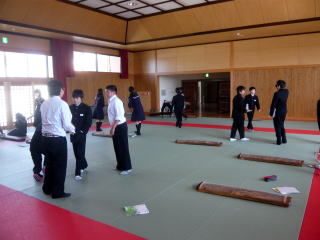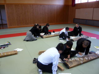 連日の雨模様から一転、 この日は素晴らしい秋晴れのもと、 私の母校でもあります、 滋賀県東近江市立船岡中学校の 音楽の授業へ行ってまいりました。 二十数年前の学び舎は新しく改築され、 昔の面影はありませんでしたが、 どことなく懐かしい雰囲気が致しました。 ![]() 船岡中学校HPでの当日の授業風景の紹介はこちら 本日は武道場での授業です。 本校の1年生は3クラスありますが、 お箏の面数が足りないため、 1クラス50分授業の中で 生徒さんたちは3人一組で文化箏にて学ばれます。 ![]() 最初のクラスの皆さんは 柱をたてるところから始まりましたので、 お調絃に時間がかかりました。 初めて体験する慣れないお箏の授業でしたが きちんと正座をしご挨拶してくださいましたし、 私の演奏の際には姿勢を正し、 静かに鑑賞してくださいました。 ![]() まずはじめに、前回配られたプリントを見ながら、 お箏の各部の名称や、 何から出来ているかなどをお勉強して頂いたあと、 「世界に一つだけの花」を演奏させて頂き、 皆様になじみのある現代曲で、 実際にお箏の音色を聞いて頂きました。 次に「六段の調」です。 この曲は鑑賞の課題曲だそうです。 時間の都合上初段だけを演奏いたしましたが、 先ほどとはまた違う雰囲気で、 弾き方など興味深そうに聞いてくださいました。 そして、座り方や弾き方の名称 (合わせ爪やすくい、トレモロなど)を、 実際に見ていただきながら お勉強していただきました。 このあとはいよいよ皆様が3人一組で 「さくらさくら」を弾かれます。 今までに1~2回ほど先に音楽の授業をされた中で、 曲を聞いたり、少し弾いたりはされていたようですが、 やはりぎこちない様子です。 ![]() お爪の数やサイズが足りないため、 親指のみにはめて練習です。 まずは音楽の先生の号令で弾き始めますが、 皆さん思い思いに演奏されます・・・ 真正面に座ったり、 龍角から遠く離れた位置で弾いてみたり、 支えをしないで親指だけで弾いてみたり・・・ ![]() それらを見ながら横について、構え方や座る位置、 お爪のあて方、支えの仕方などを教えていきます。 何回か練習を重ねていくと、 姿がサマになってきた生徒さんも たくさんおられました。 ![]() また、生徒さんから「これでいいですか?」と 熱心に聞いてくださる場面もありました。 50分という短い時間の中で どれだけお教えできたかわかりませんが、 2週間後には十七絃を持って行き、伴奏を入れて、 皆さんで「さくらさくら」を合奏する予定です。 今日お教えしたことが 2週間後生かされていますように・・・ 楽しみにして、次回に臨みたいと思います。 長谷野教室・八日市本町教室 教師 山階由紀美 |