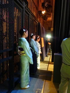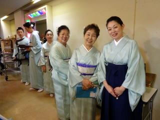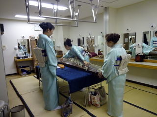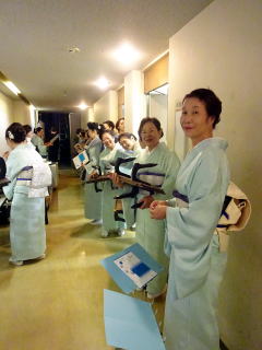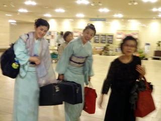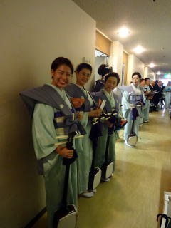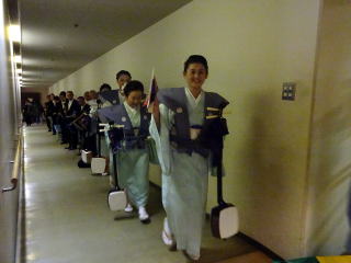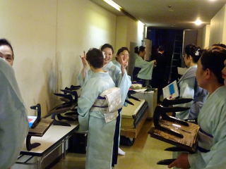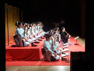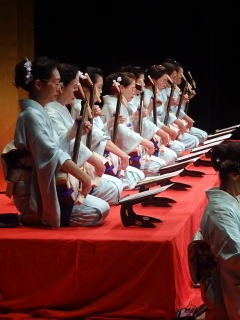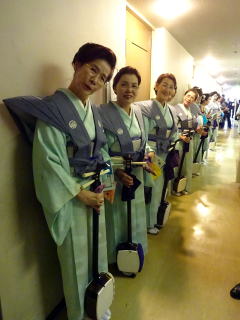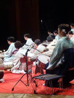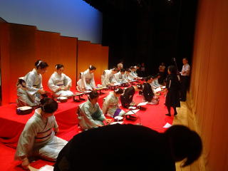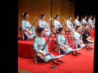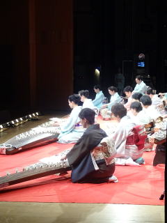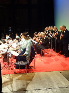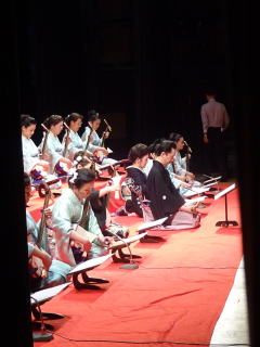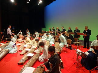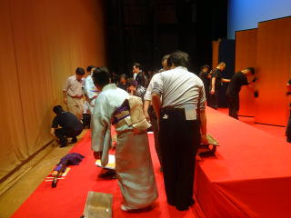 毎年出演させて頂いております、 大文連『花の宴』のステージ。 この日、大ホールに於きましても 催しが開催されていましたので わたくしたちが出演させて頂いた 中ホールでの演目は、 例年に比べて少なめのプログラムでございました。 ![]() ![]() わたくしたちの出演は、 堺三曲協会より『五丈原』 そして淀の会より 『夕顔』と『まりと殿様』の3曲で ステージに立たせて頂きました。 堺三曲協会メンバーより『五丈原』 舞台セットをしている様子です。 ![]() そして緞帳が上がり演奏です。 あいにくどのステージも、 客席正面からの写真がございませんので 残念ですが…。 ![]() ![]() お仲間が心配そうに、 舞台袖より眺めています。 ![]() 本日も、お調絃係りの皆様が 頑張ってくださいます。 ![]() ![]() ご用意頂いた楽屋が和室なんて、 珍しいですね。 ![]() ![]() ![]() さて続いて『夕顔』の演奏でございます。 尺台をお願い致しましたので 会場の舞台の皆様が、快くセットくださいます。 ![]() 舞台袖では、緊張しながら 待機しております。 そして舞台の準備が整いましたら わたくしたち、スタンバイさせて頂きます。 ![]() ![]() この度の夕顔。 永廣孝山先生が、 16名の三絃をお相手くださいます。 練習に練習を重ねてまいりました成果が 発揮できるよう頑張って演奏致します。 ![]() ![]() ![]() 淀の会出演最後の曲は『まりと殿様』 この曲は、今までにも何度も演奏してまいりましたし 大合奏でお届けいたしますので 楽しんで演奏したいと存じます。 演奏写真はございませんが、 本番前のメンバーのリラックスした表情です。 「楽しんで演奏してまいりま~す」 ![]() ![]() ![]() ![]() ![]() ![]() 今日も一日お疲れ様でございました。 楽屋で最後のご挨拶をして、 皆様解散です。 ![]() ![]()