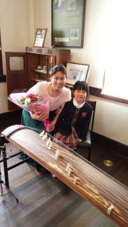 本日、旧水口図書館(ヴォーリズ建築)におきまして、 毎月第ニ火曜日に開催されています火曜喫茶室で、 お箏の演奏をさせて頂きました。 昨日は寒の戻りで、北風が強く、 とても寒い一日でしたが、 本日は天気も良く少し暖かい日となりました。 「桜とお箏の演奏会」と題しておりましたが、 残念ながら桜は散ってしまいました。 それでも、春らしい曲をご用意致しましたので、 お聴き頂いたお客様には、 春を感じて頂けたのではないでしょうか。 まず初めに【独奏・さくらさくら】です。 桜が咲き誇っていたり、 ハラハラと舞い落ちるような情景を思い浮かべながら、 演奏させて頂きました。 ![]() 他には【春よ来い】【なごり雪】など、 皆さんが口ずさめるような曲や、 童謡メドレーなどを演奏致しました。 「普段聞いている曲でもお箏で演奏すると、 また違ったように聞こえて、良かったです」 と仰ってくださいました。 ![]() またこちらの建物の音響が良く、 マイクがなくても音がよく響き、 お箏の音色を楽しんで頂けたのではないかと思います。 演奏の後には、聞きに来られた方に体験で 【さくらさくら】を弾いて頂きました。 初めてお箏に触れる方が多く、 最初は戸惑っておられましたが、 しばらく弾いているとコツをつかみ、 上手に弾いておられました。 「良い体験ができました」 と喜んで頂き、嬉しかったです。 最後には、聞きに来てくださった私のお友達と その娘さんから花束も頂いて、とても嬉しかったです。 ありがとうございました。 ![]() 火曜喫茶室を主催されておられる、 稚木(わかぎ)の会の皆様には、 色々とお世話になりまして、 ありがとうございました。 長谷野教室・八日市本町教室 教師 山階由紀美 |
