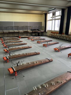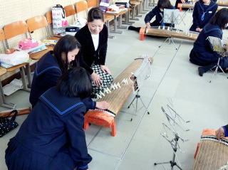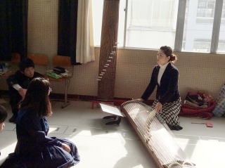 2月15日(月)、17日(水)、22日(月)の3日間、 能登川中学校より、 音楽授業・和楽器にふれるということでご依頼を受け、 ゲストティーチャーとして寄せて頂きました。 ![]() 生徒数がとても多く、 一年生はひとクラス約30人が7クラスもあり、 3日に分けて授業をさせて頂きました。 一年生の冬休みの宿題で、 和楽器について調べたという“和楽器新聞”。 ![]() とても詳しく丁寧に書かれてあり、 びっくり致しました。 今回の授業では、 ・実際にお箏の音色を聞いてみる ・さくらさくらを弾く ということがテーマです。 せっかくですので、十七絃も持って行き、 音色の違いを聞いて頂きました。 まず、十七絃の見た目にびっくり! いつものお箏よりずいぶん大きいと 皆さん口々に仰っていました。 絃の太さを見たり、弾き方の違いを見て、 音色を聞いて頂きました。 ![]() そして、お箏でもイマドキの曲も演奏できます、 ということで【世界に一つだけの花】を 演奏いたしました。 お箏で聞くと、POPSも雰囲気が違うと びっくりされていました。 ある生徒さんはお箏の音色に 「涙出そう…」と感想を述べられ、 私はとても嬉しく感じました。 いよいよ次は皆さんが弾く番です。 こちらの学校では20面ほどもお箏があり、 2人一組になって練習することができました。 ![]() 親指にお爪をはめ、座る位置を確認し、 皆さん一生懸命練習されます。 ![]() お爪は弾いたあと次の絃にしっかりあてて、 龍角に近い位置で弾く。 この弾き方を基本に、 しっかり音を出して弾くことができました。 アドバイスをすると、皆さん飲み込みが早く、 上手に弾いておられました。 最後には十七絃を入れて合奏いたしました。 50分という短い時間の中、一生懸命取り組まれ、 お箏や和楽器に少しでも興味を持ってくださったら、 とても嬉しく思います。 これからも若い世代の人たちにも お箏の魅力を知っていただけるように、 頑張って参りたいと思います。 能登川中学校の先生方には 大変お世話になりましてありがとうございました。 長谷野・八日市本町教室 淀の会 教師 山階由紀美 |