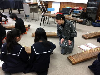 昨年に引き続き、 今回3度目となりました。 私の母校でもあります 滋賀県東近江市立船岡中学校よりご依頼を受け、 音楽の授業にゲストティーチャーとして 寄せて頂きました。 ![]() 恒例の校歌合唱も一番はしっかり思い出せ、 一緒に歌うことが出来ました。 授業では、昨年と同様にまず鑑賞の課題曲 『六段の調』についてです。 音楽の先生から作曲者である 八橋検校について述べられました。 ![]() その後、私からは この曲で使われる技法について、 一部実演をしながらご説明致しました。 音楽の先生から生徒の皆さんへ 「西洋音楽にはない“余韻”を 実際に生で聴いて感じて欲しい」 と言われ、皆さんは手の動きに注目しながら、 じっと聞いてくださいました。 後押し、ヒキイロ、ツキイロ・・・ 「どれが後押しやった? ツキイロってどんなんやった?」 などひそひそ声で話す声が聞こえ、 お箏の音色に興味を持って くださってると感じました。 色々な余韻を覚えたら、 次は曲の鑑賞に入ります。 この曲は段ものですので、 今どの段を弾いているかわかりやすくするために、 弾きながら段の始まりには 「次から二段です」などと お声をかけながら進めました。 ![]() 終わりましたら、印象に残った弾き方など 曲の感想を述べてくださいました。 一番印象に残ったのは “裏連”“輪連”の弾き方で、 皆さんが見たことないような弾き方に 驚かれていました。 生徒さんの中にはご自分でも弾いてみようと 見よう見まねで弾いている姿も見られました。 実践では『さくらさくら』が課題曲です。 先の授業で、座り方やお爪のあて方、 支えの仕方などはお勉強されているので、 皆さん上手に弾いておられました。 少しアドバイスをすると飲み込みも早く、 上達が早いです。 ![]() 50分授業を2クラス見させて頂きましたが、 あっという間に時間が過ぎてしまうくらい 充実した時間でした。 皆さん難しいと言いながらも本当にお上手で、 また真剣に取り組む姿を見せて頂き嬉しく、 私自身もお勉強させて頂きました。 来週には十七絃を持って行き、 皆さんと『さくらさくら』を合奏致します。 今からとても楽しみです。 教師 山階 由紀美 |