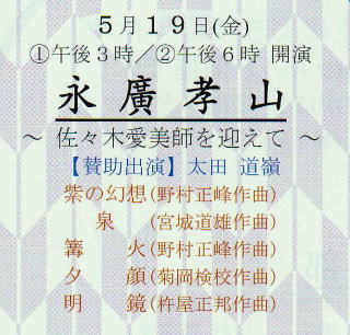 この度も永廣孝山先生より ご依頼を頂戴致しまして、 なかにし楽器店様での 『邦楽さろん』に出演させて頂きました。 ![]() 今回は古典曲『夕顔』も 一曲組み入れてのプログラム。 他には、野村正峰先生の『紫の幻想』『篝火』 杵屋正邦先生の『明鏡』 宮城曲『泉』は大変好評を頂き、 お楽しみ頂けたようでございます。 午後3時、そして6時からの2回公演でしたが 大変多くのお客様にお越し頂き、 誠に有難うございました。 ![]() |
