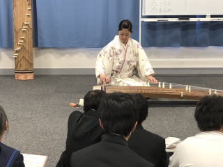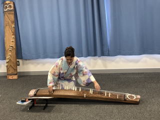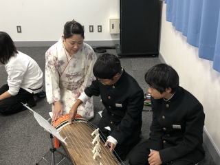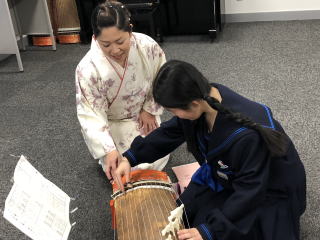 昨年に引き続きまして、今年も 滋賀県東近江市立能登川中学校の音楽授業に 講師として寄せて頂きました。 毎年3学期に行われる和楽器の授業ですが、 今年は少し早く2学期に行われました。 1年のクラスは6クラスあり、 12日に4クラス、19日に2クラスの 授業に入らせて頂きました。 ![]() 授業では「六段の調」の鑑賞から始まり、 曲のスピードや、CDだけでは分かりづらい 「余韻」に注目されながら、 聞くだけでなく見ても学習されました。 そのあとは「さくらさくら」の演奏に入り、 座り方や弾き方など、ご指導させて頂きました。 ![]() ![]() そして最後には、私も生徒さんと一緒に、 お箏で合奏致しました。 クラスによっては 数回練習されていることもあり、合奏すると、 よりまとまりがある演奏になったかと思います。 そして最後には、皆様に 「いつも何度でも(千と千尋の神隠しより)」を お聞きいただきました。 ![]() お箏でも、こんな曲が弾けるんだなと びっくりしていらっしゃいました。 ![]() 最近では和楽器の授業が増え、 お箏を触ったり聞いたりしたことがある方も 増えてまいりましたので、 このように、どんどん和楽器の魅力が 伝えられると嬉しいです。 能登川中学校の校長先生、 担当の先生には毎年ご依頼を頂きまして、 感謝致しております。 ありがとうございました。 そして、滋賀でこのように 活動させて頂けますのも、 宗家先生、愛美先生のご指導と ご理解があってこそと思っております。 教師 山階由紀美 |