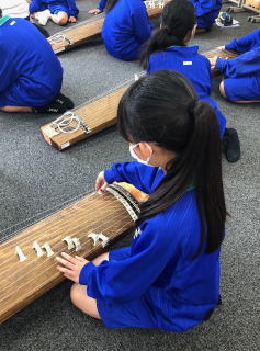 今年はコロナ禍で活動が 自粛される中ではありますが、 ありがたいことに 滋賀県東近江市立能登川中学校から ご依頼いただきまして、 音楽授業に講師として寄せて頂きました。 例年は1回の授業だったところ、 今年は2回入らせて頂くこととなり、 お箏導入部分と、まとめの時間に 授業させて頂きました。 今年の1年生は7クラスありますので、 2日に分けての授業です。 前半の授業ではお箏について、 有名な曲である『六段の調』について 先生がお話しされました。 ![]() 作曲者である八橋検校の生い立ち、検校とは何か、 など歴史的なこともお話しされ、 その後鑑賞していただきました。 ![]() CDだけでは分かりづらい余韻に注目されながら、 どのような弾き方をすれば、 どのような余韻が生まれるのか聴くだけでなく 目で見て学習されました。 ![]() そのあとは「さくらさくら」の演奏に入り、 座り方や弾き方など、ご指導させて頂きました。 ![]() 最初はぎこちない弾き方だった生徒の皆さんも、 少しアドバイスするとグンと吸収され、 しっかりした爪音が聞こえてきました。 ![]() 3週間後には十七絃を入れて、 皆さんと合奏する予定です。 どんな感じで合奏できるのかとても楽しみです! |