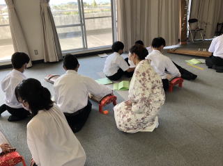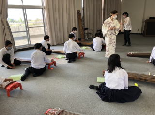 10月に入ったというのに、 この日は30度近い気温。 まるで夏のような暑さで、 汗が止まりませんでした。 今回初めて寄せていただきました 愛東中学校は、 メロンやブドウなど フルーツが有名な地域にございます。 ![]() こちらの教頭先生は 前年までお世話になっておりました 船岡中学校の音楽の先生で、 そのご縁もございまして 今回音楽特別授業の講師にと お声をかけて頂きました。 先生よりご縁を頂きまして、 大変嬉しく思っております。 ありがとうございました。 初めてお会いする音楽担当の先生は とてもお話ししやすい方で、 また、授業の流れも これまでと同じ流れでさせて頂きましたので、 スムーズに進めることができました。 最初は「六段の調」を 鑑賞していただきました。 ![]() いろんな余韻の変化(ヒキイロや後押しなど)を 実際に見て、聴いて、 感じて頂けたようです。 音楽の先生からは、 「みんな、いつになく集中して聴いていました」 と仰って頂きました。 そのあとは「さくら」の練習です。 お箏は他校からお借りされたようですが、 一面で2人ずつ、じっくり練習することができました。 ![]() 座り方やお爪の当て方など 確認しながら弾いていきます。 ![]() 「親指がズレるんです。 どのようにしたらしっかり弾けますか?」など、 熱心に質問される生徒さんも何人かおられ、 興味を持って 授業に取り組まれていたように思います。 次回の授業では十七絃と合奏致します。 どのような「さくら」になるか、 今からとても楽しみです。 教師 山階由紀美 |